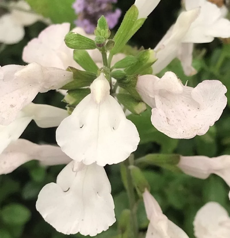 Salvia microphylla Glacier, Salvia ornamentale da fiore, che ama l'esposizione soleggiata, vuole poca acqua e fiorisce di colore bianco da aprile fino a novembre.